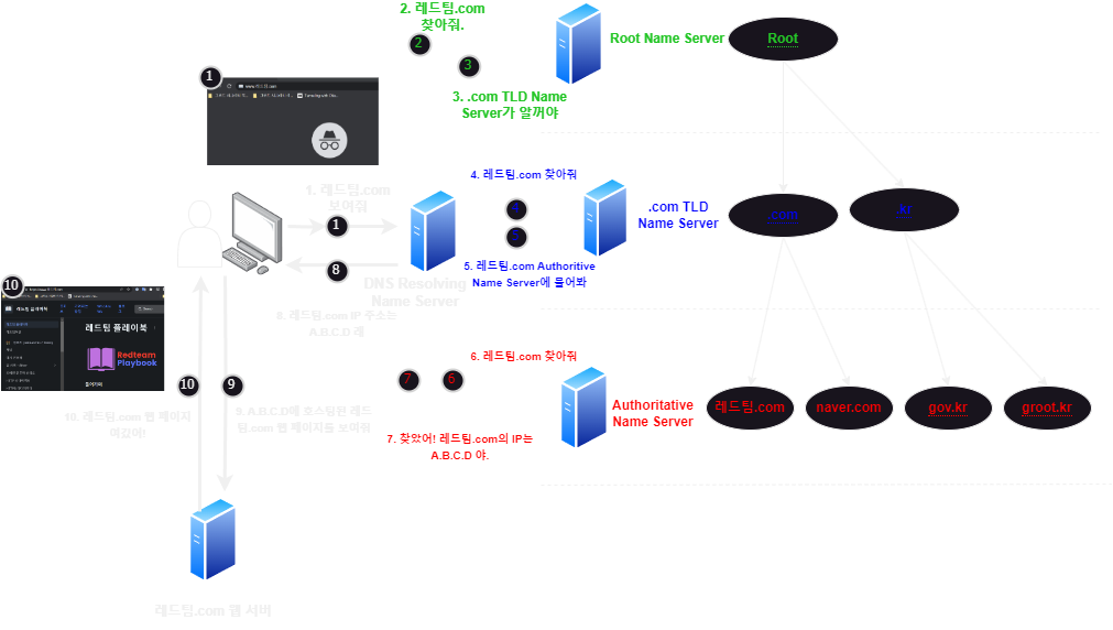 * DNS Resolving Name Server: Local DNS Server한테 물어볼께. Local DNS Server! [www.레드팀.com](http://www.레드팀.com) 아이피 뭐야?
