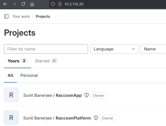 앞서 DPAPI로 얻은 Banerjee.Sunil 유저의 계정 정보로 로그인을 하면 라쿤테크 외주 프로젝트인 라쿤앱과 라쿤 플랫폼의 소스코드를 담은 프로젝트들이 보인다. Banerjee.Sunil 유저는 해당 프로젝트의 PM으로서, 리포들에 대한 모든 권한을 갖고 있다.