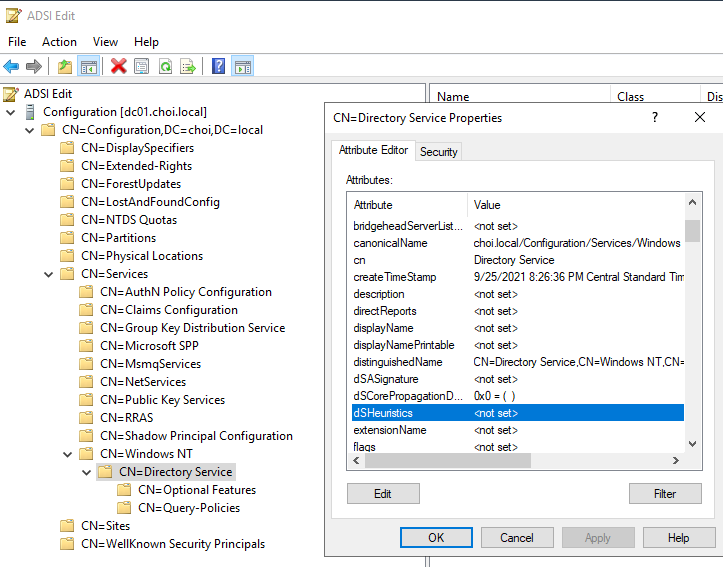 * ADSI Edit > "Configuration" > CN=Services > CN=Windows NT > CN=Directory Service > Properties > dSHeuristics = \<not set> OR `NOT 0000002`.