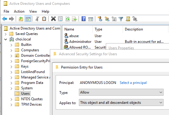 * Remove `Anonymous LOGON` groups having `READ` permission on `Users` Container.