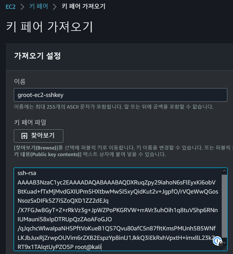 이후 AWS에서 EC2를 검색한 뒤, 왼쪽의 메뉴를 쭉 내려 `네트워크 및 보안 -> 키 페어` 로 간다. 오른쪽 위의 `작업 -> 키 페어 가져오기` 를 누른다. 이름을 지정해주고, 아래의 텍스트상자에 공개 키 `grootssh.pub` 의 내용을 복사/붙여넣기 해주면 끝이다.