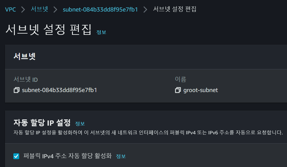 서브넷 생성 후 오른쪽 클릭 -> 서브넷 설정 편집 -> "퍼블릭 IPv4 주소 자동 할당 활성화" 를 설정한다.