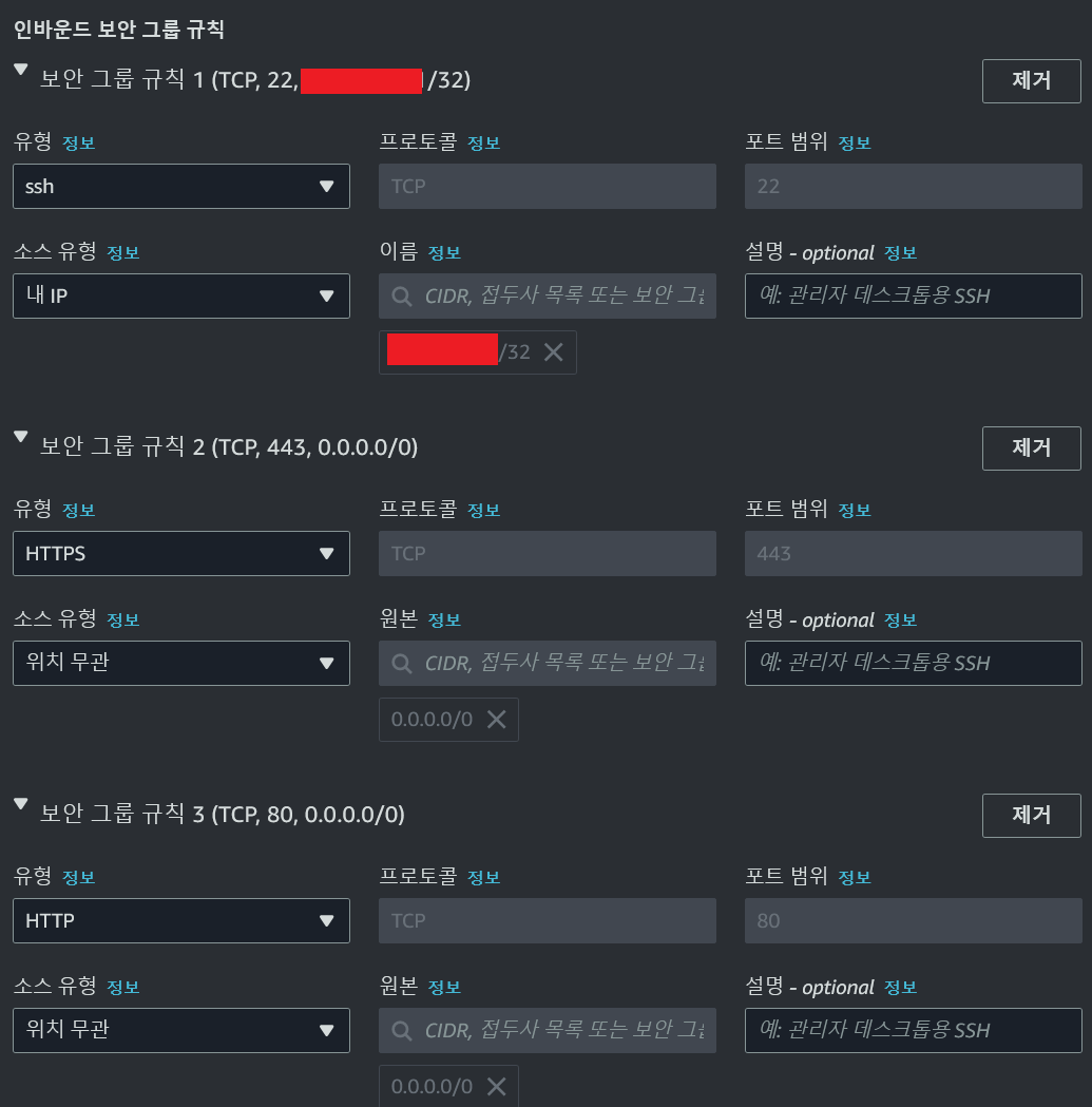 그 뒤, 방화벽 설정에서 오로지 본인의 집 주소 IP에서만 SSH와 TCP/443가 가능하도록 설정한다. "내 IP" 를 누르면 본인공개IP/32 가 자동적으로 설정된다.