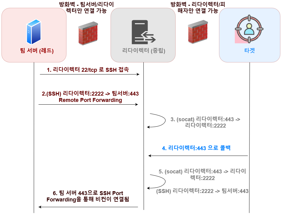 2. SSH 리모트 포트 포워딩을 통해 팀서버 -> 클라우드 접근은 가능하지만, 반대로 클라우드 -> 팀서버로의 접근은 오로지 SSH 터널을 통해서만 가능하도록 만든다. 이는 만약 리다이렉터 서버가 장악당했을 경우 공격자들이 팀서버를 향해서 어떤 네트워크적 트래픽도 보내지 못하게 하기 위함이다.