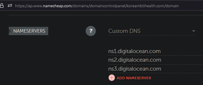 도메인 레지스트라에서 도메인을 구입했다면 네임 서버를 클라우드 프로바이더로 설정한다. 예를 들어 이 실습에서는 NameCheap + DigitalOcean 을 사용하고 있기 때문에, NameCheap 으로 가서 도메인의 네임 서버를 DO의 네임서버 3개로 지정해주면 된다.