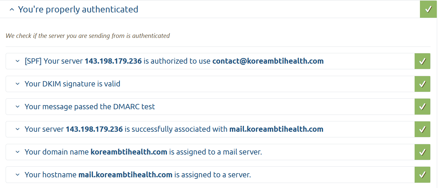 점수가 높게 나오건 낮게 나오건 일단 중요한 섹션은 `You're Properly Authenticated` 이 부분이다. 이 부분의 SPF, DKIM, DMARC, rDNS 섹션에 모두 체크마크가 있다면 성공한 것이다. 만약 없다면 DNS 레코드 및 DKIM 문자열 등을 다시 한 번 체크한다.