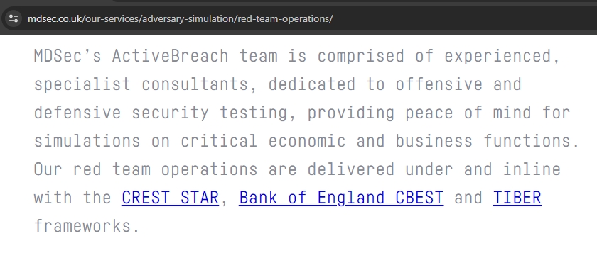 영국 및 유럽 보안 컨설팅 업체들은 평가 체계와 프레임워크를 기반으로 한 레드팀 서비스 제공을 마케팅 포인트로 삼고 있다. 예를 들어 NightHawk C2 프레임워크로 유명한 MDSEC은 CREST 인증을 통해 CBEST, TIBER, STAR 관련 프로젝트를 진행할 수 있다는 홍보를 한다.